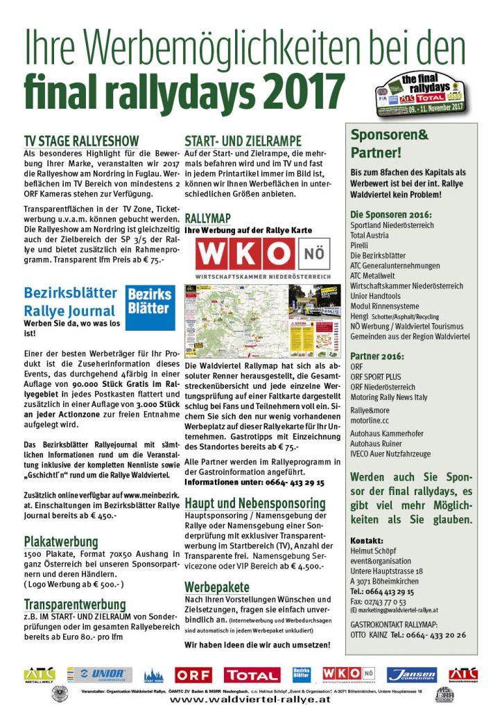 Manfred Stohl, Andreas Waldherr, Patrick Winter u. Alexander Tazreiter schon aktiv. Vorbereitungen der „final rallyedays“ verlaufen laut OK Chef Helmut Schöpf […]